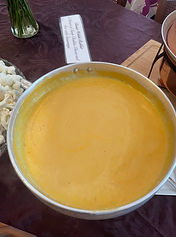 Rub fondue pot with garlic. Add wine and heat until bubbly. Add cheese a little at a time until it melts. Add the balance of the ingredients, stirring well.