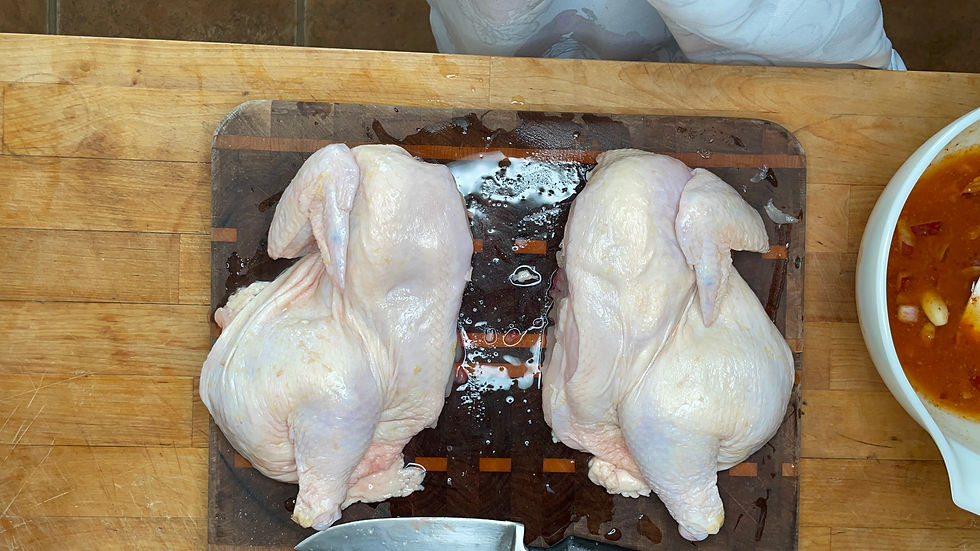 Split chickens in half lengthwise. Brush generously on both sides with Golden Ember Sauce. Refrigerate overnight. Place on a grill, hollow side down, over white coals. Cook 20 to 25 minutes, brush with sauce and turn. Cook 20 minutes more.