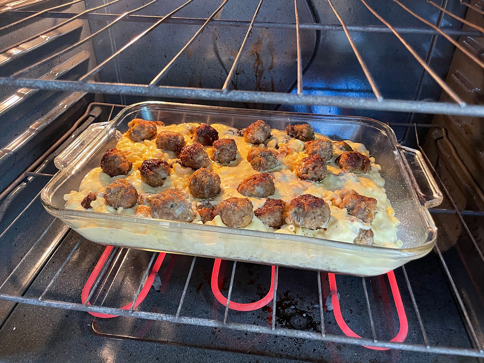 Cook macaroni as directed on package. Combine milk, butter, cheese, onion, salt and pepper. Stir to melt cheese. Beat egg whites until stiff but not dry. Beat egg yolks thoroughly. Add gradually to hot milk, stirring constantly. Add bread crumbs. Mix well. Remove from heat and fold in egg whites. Fill the bottom of a well greased casserole with half of the macaroni. Pour in half of the milk mixture. Add half of the meat balls. Add remaining macaroni and sauce. Arrange meat balls over the top. Place in a shallow pan and fill with 1 inch of hot water. Bake in a 375 degree oven for 50 to 60 minutes.