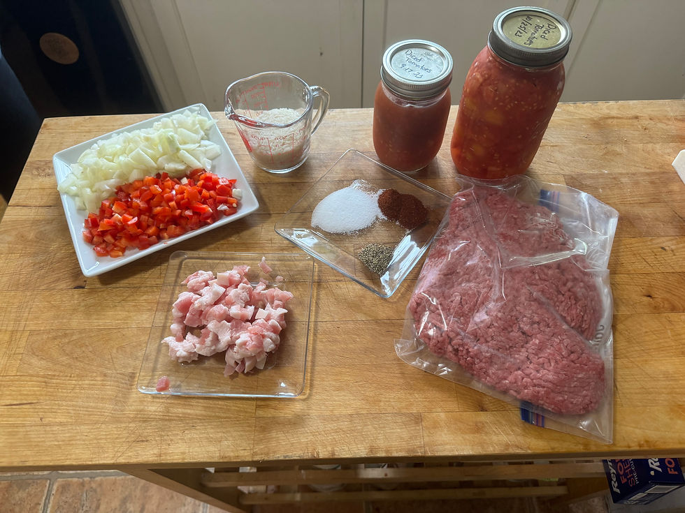 Fry bacon and add onions, bell pepper and hamburger. Cook for 5 minutes. Add remaining ingredients and simmer for 1 hour. Add a little water if needed.